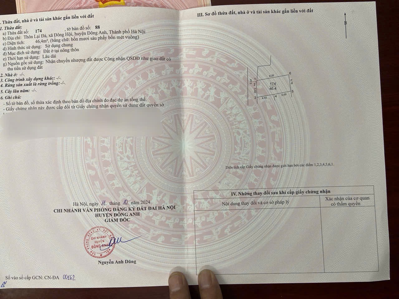 Cần bán 46,4m2(4,8×9,7) đất Lại Đà, Đông Hội, Đông Anh đường rộng 2,8m hướng Tây vị trí cách cầu Đông Trù 500m cách trung tâm hội chợ triển lãm quốc gia và khu đô thị mới Vinhome Cổ Loa 800m giá 95 triệu