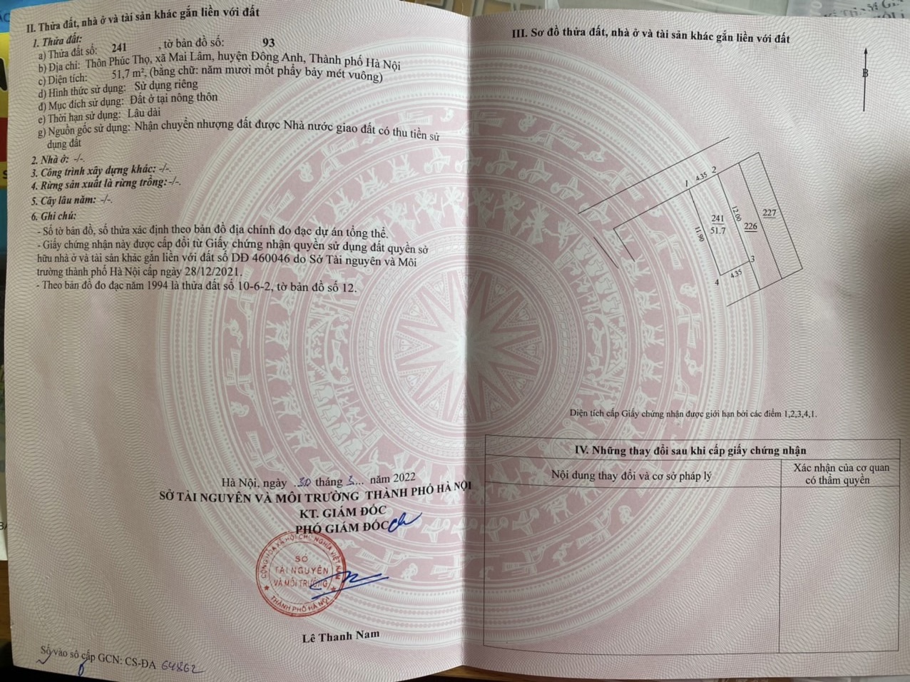 Cần bán 50m2(4,5×11) đất trục đường Phúc Thọ, Mai Lâm, Đông Anh đường rộng 5m hướng Đông Bắc cách cầu Đông Trù 700m cách trung tâm hội chợ triển lãm quốc gia và khu đô thị mới Vinhomes Cổ Loa 1,5km Giá 45 triệu liên hệ Mr Giảng 0916175299
