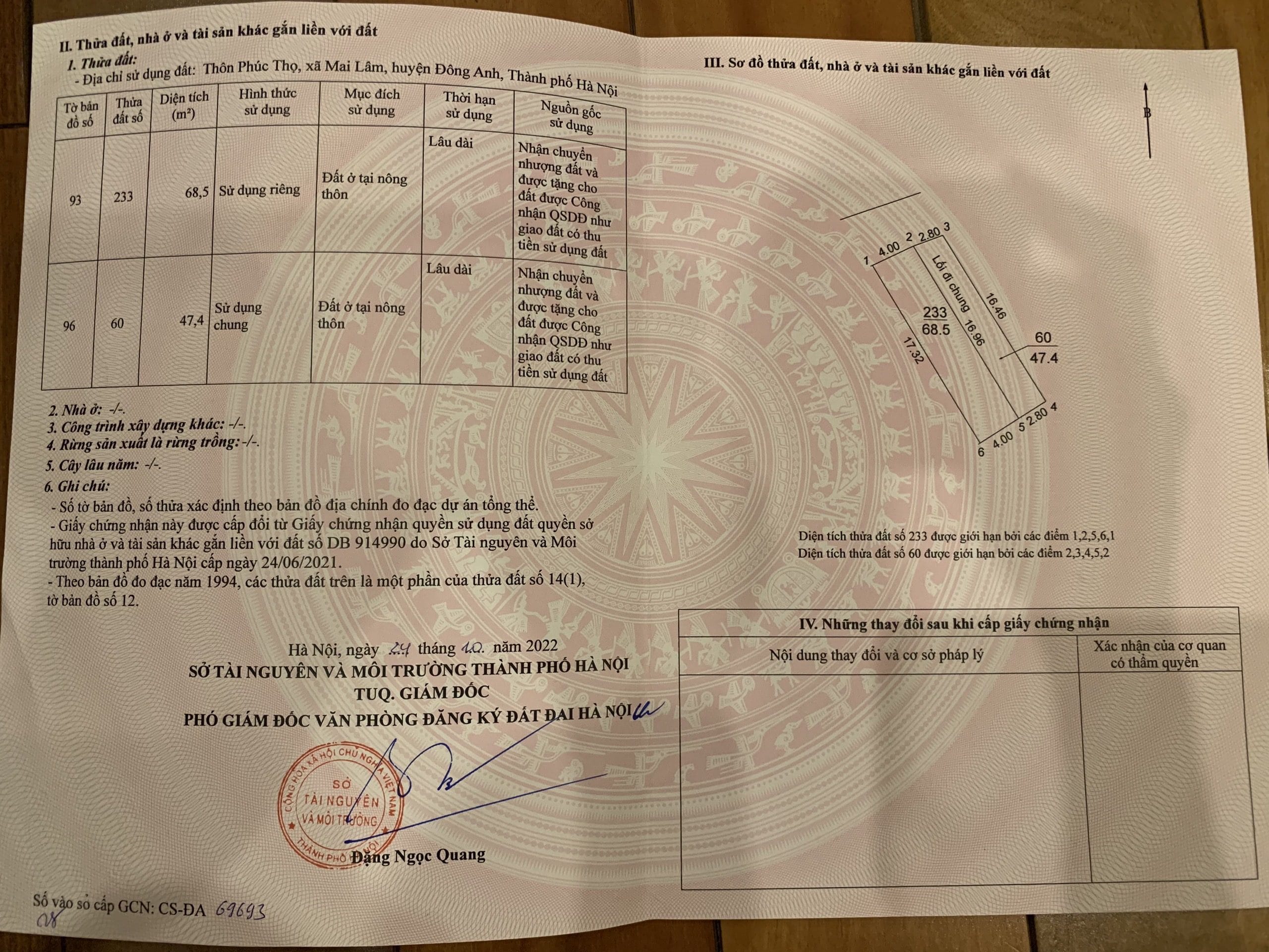 Cần bán 68,5m2(4×17,1) đất trục chính thôn Phúc Thọ, Mai Lâm, huyện Đông Anh
